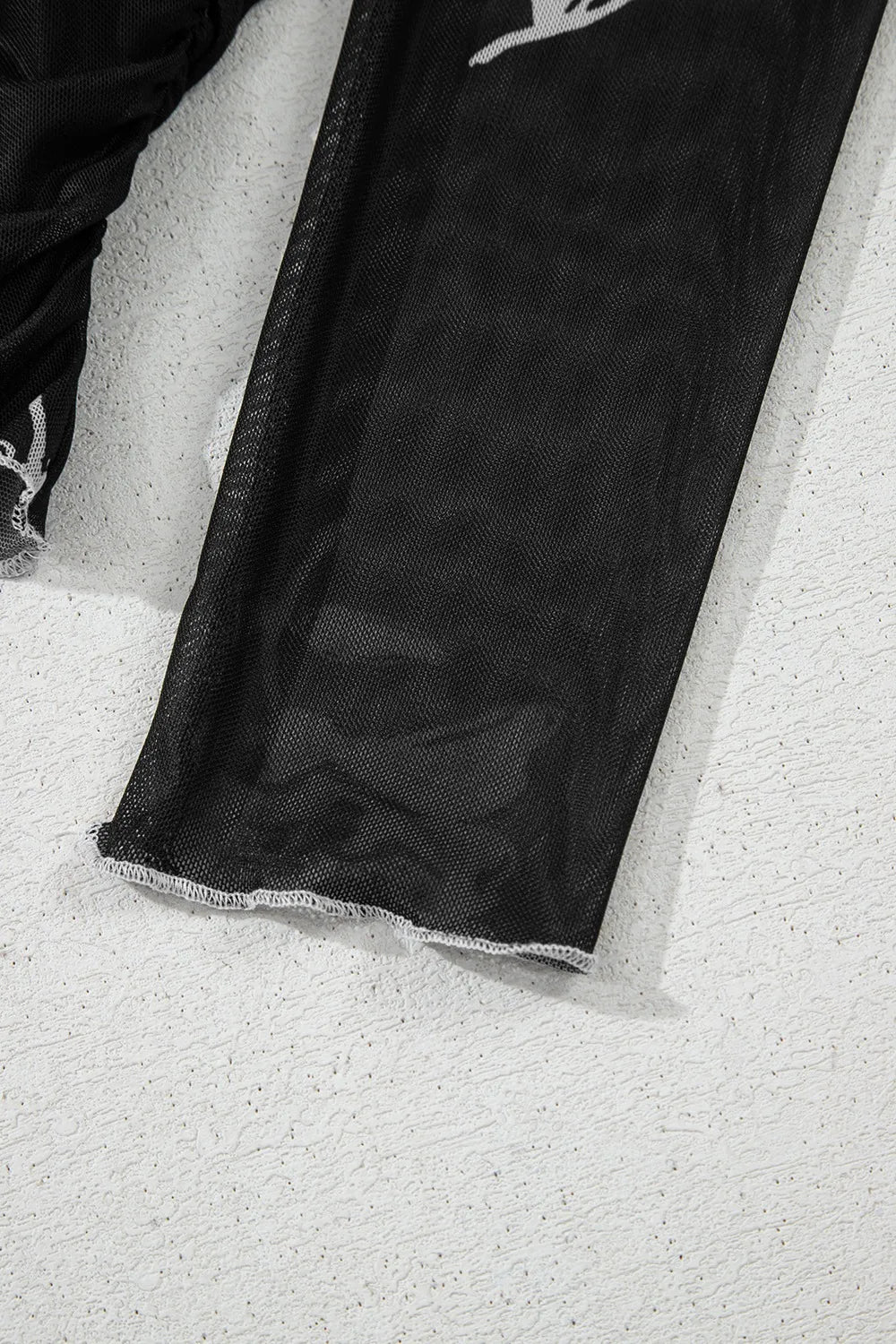 TrendsiFloral Mesh Lettuce Edge Ruched Slim Long Sleeve Top